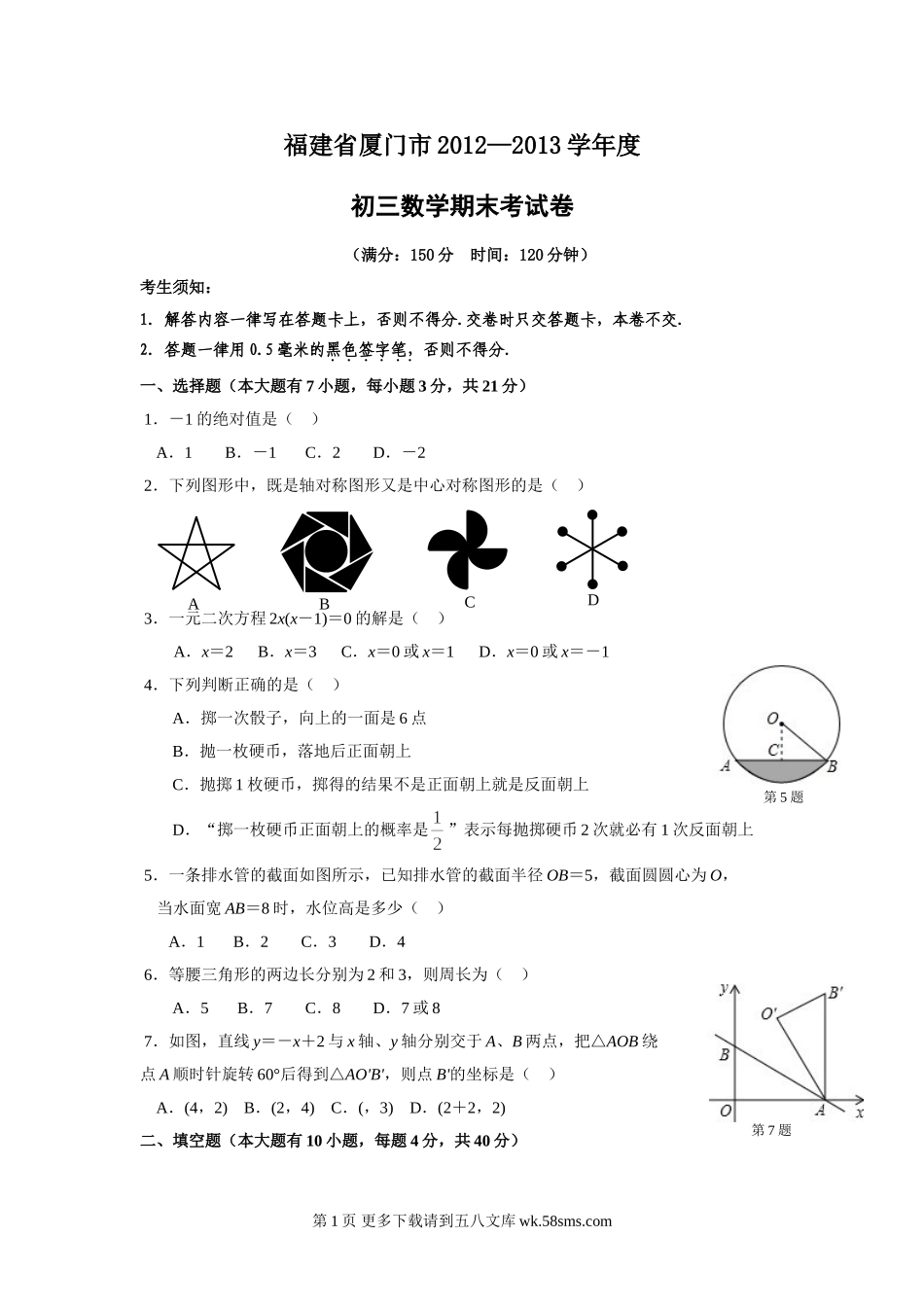 福建省厦门市2012—2013学年度初三数学期末考试卷(满分:150分时间:120分钟)考生须知:1.解答内容一律写在答题卡上,否则不得分.交卷时只交答题卡,本卷不交.2.答题一律用0.5毫米的黑色签字笔,否则不得分.一...