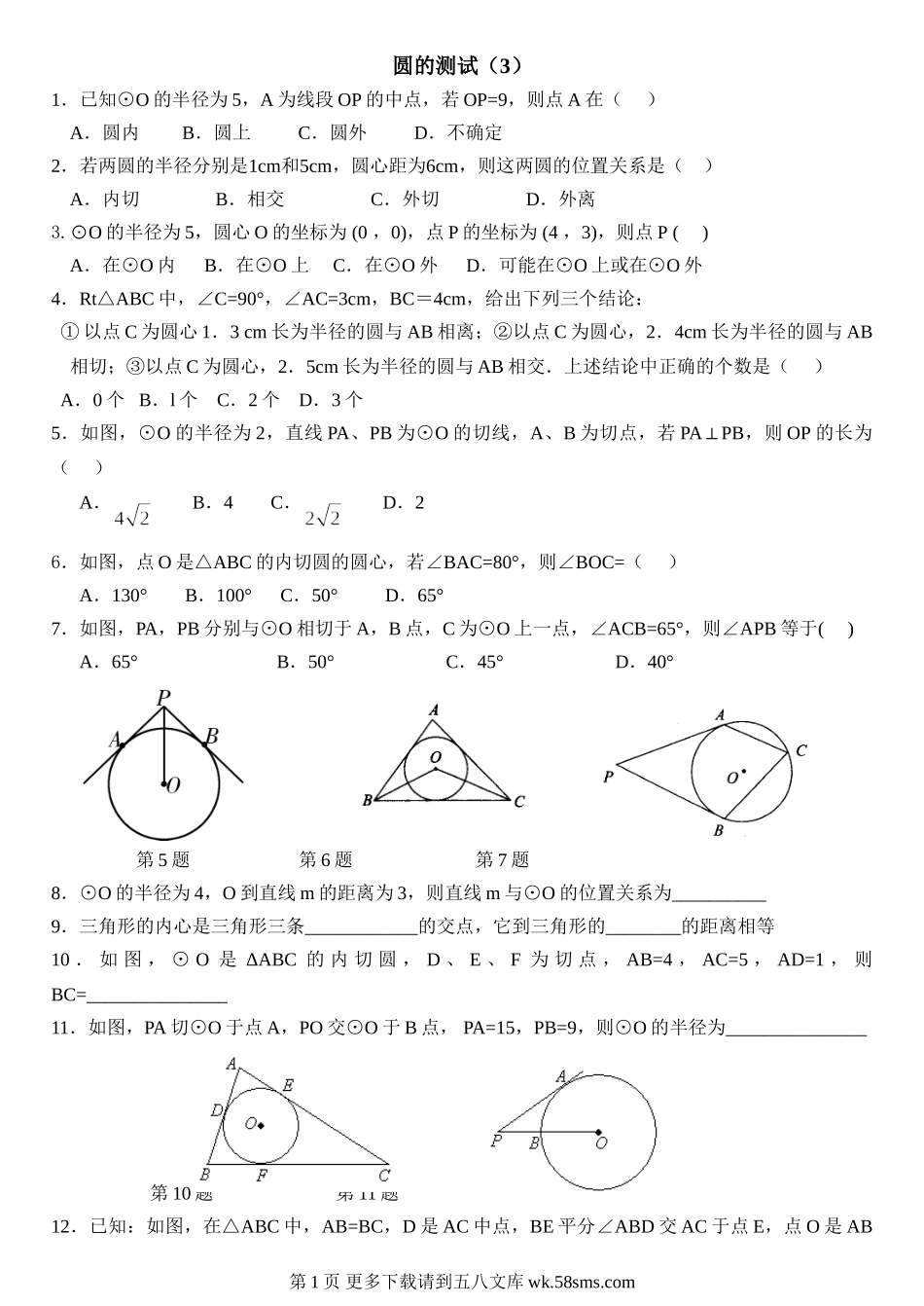圆的测试(3)1.已知⊙O的半径为5,A为线段OP的中点,若OP=9,则点A在()A.圆内B.圆上C.圆外D.不确定2.若两圆的半径分别是1cm和5cm,圆心距为6cm,则这两圆的位置关系是()A.内切B.相交C.外切D.外离3...