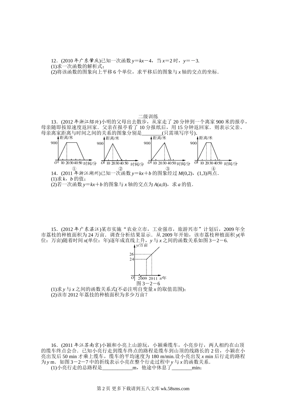 第2讲一次函数一级训练1.(2012年湖南株洲)一次函数y=x+2的图象不经过第__________象限.2.(2012年贵州贵阳)在正比例函数y=-3mx中,y随x的增大而增大,则P(m,5)在第__________象限.3.(2011年浙江义乌)一次...