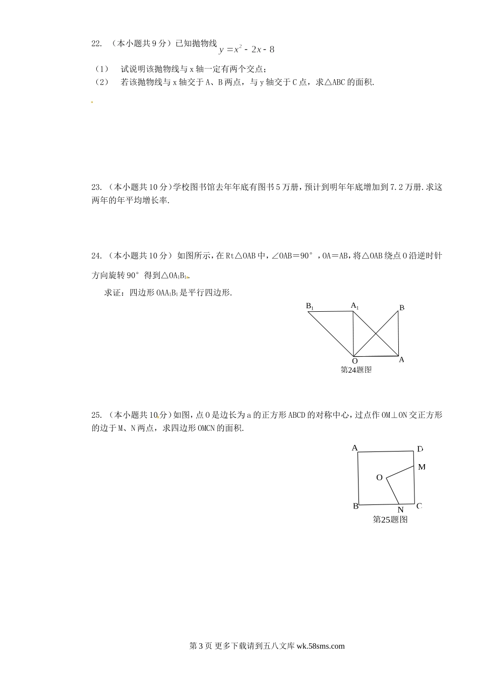 第10题图CBA一、选择题:(每小题3分,共36分)1.下列图形中绕某个旋转180°后能与自身重合的有().①正方形;②长方形;③等边三角形;④线段;⑤角;⑥平行四边形5个B.2个C.3个D.4个2.方程240x的根是()A.2...