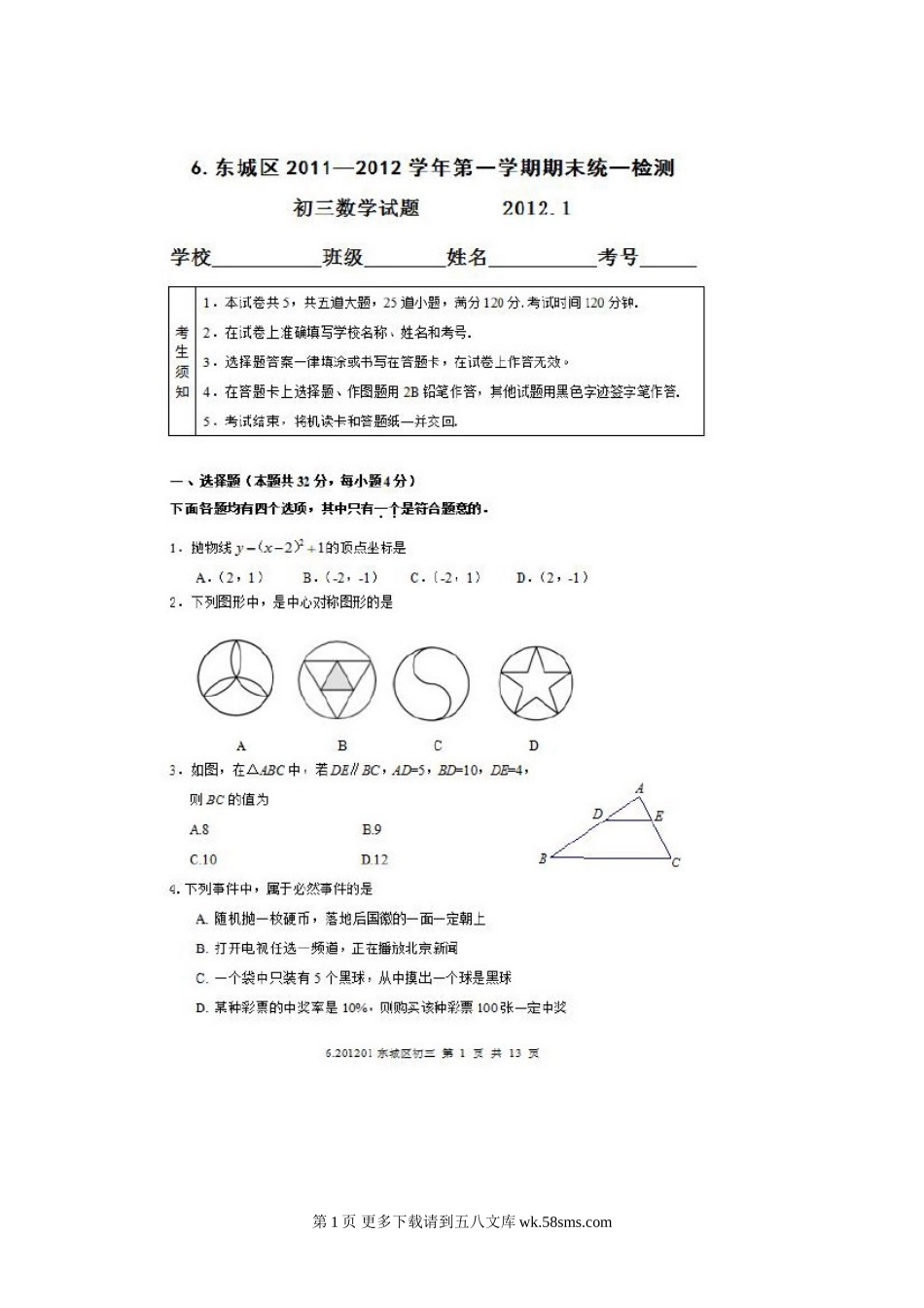 2012年东城区九年级数学期末试题及答案(扫描).doc_第1页