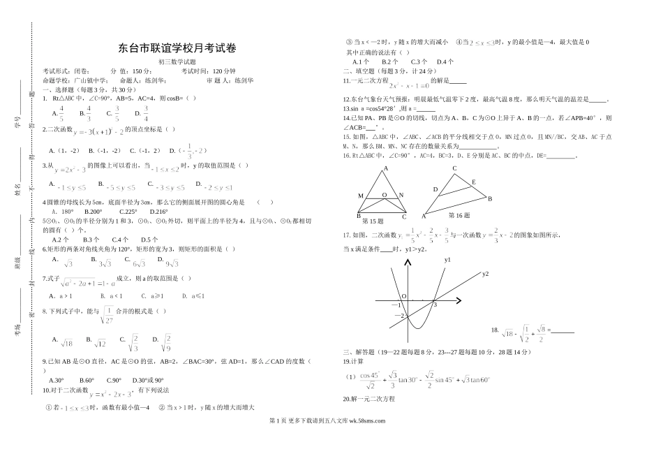 东台市联谊学校月考试卷初三数学试题考试形式:闭卷;分值:150分;考试时间:120分钟命题学校:广山镇中学;命题人:练剑华;审题人:练剑华一、选择题(每题3分,共30分)1.Rt△ABC中,∠C=90°,AB=5,AC=4,...