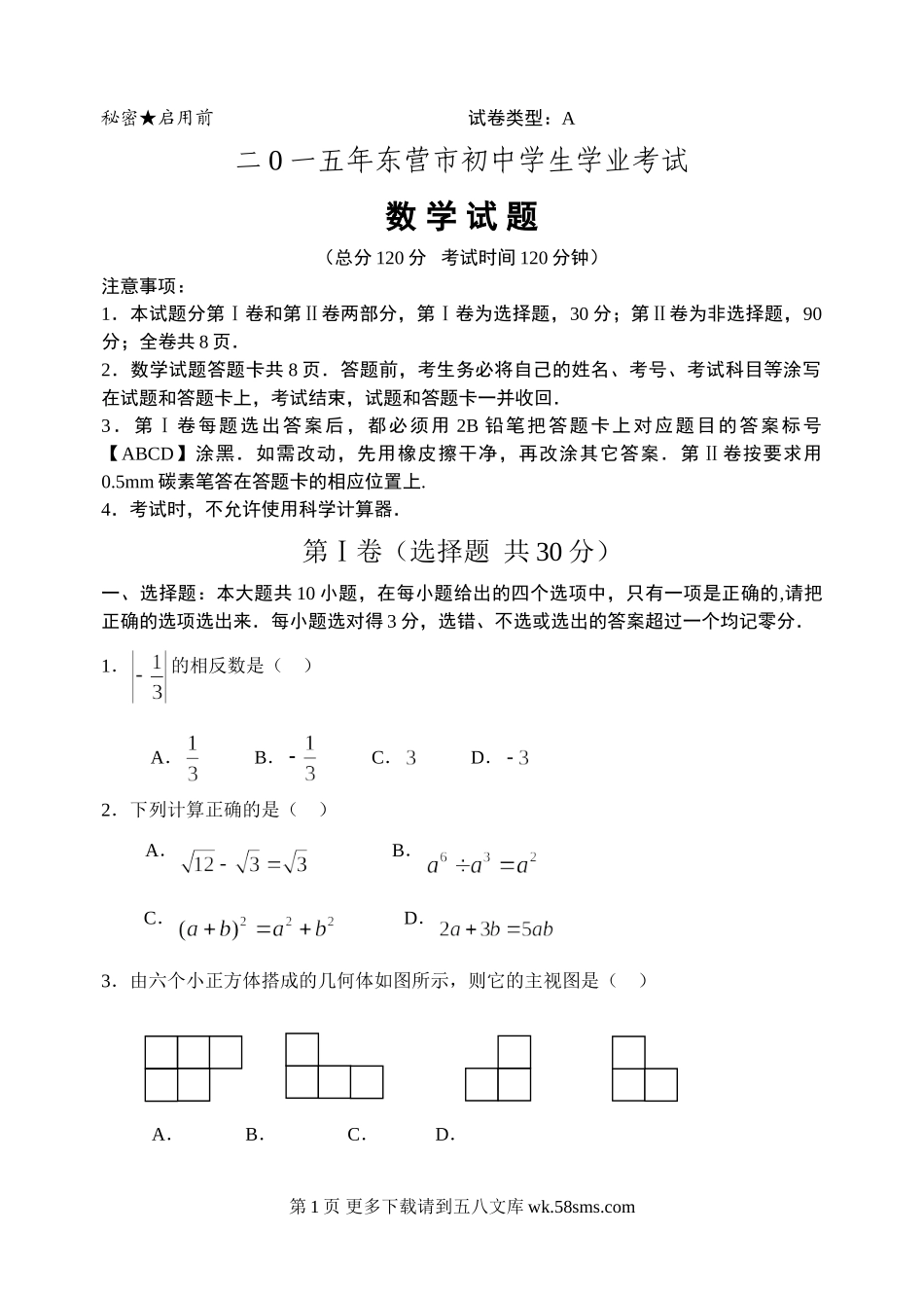 秘密★启用前试卷类型:A二0一五年东营市初中学生学业考试数学试题(总分120分考试时间120分钟)注意事项:1.本试题分第Ⅰ卷和第Ⅱ卷两部分,第Ⅰ卷为选择题,30分;第Ⅱ卷为非选择题,90分;全卷共8页.2.数学...