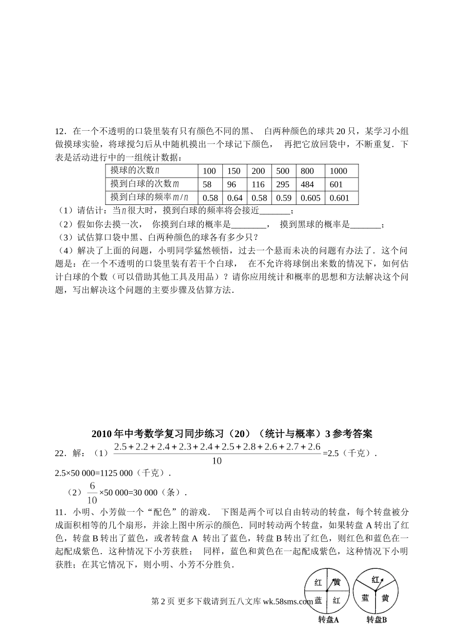 2010年中考数学复习同步练习(20)(统计与概率)3姓名一、选择题:1.把养鸡场的一次质量抽查情况作为样本,样本数据落在1.5~2.0(单位:千克)之间的频率为0.28,于是可估计这个养鸡场的2000只鸡中,质量在1.5...