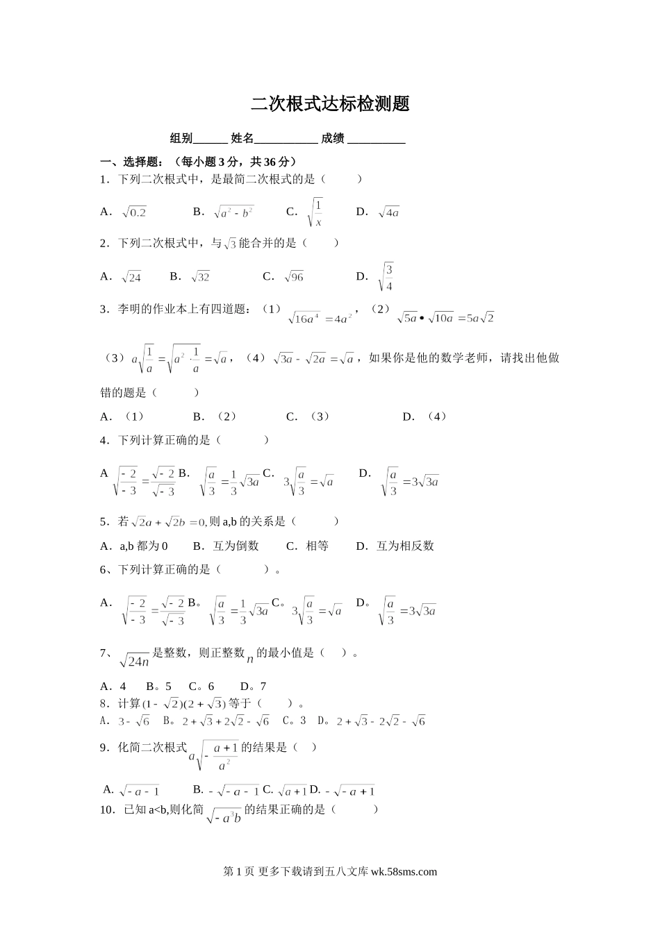 二次根式达标检测题组别______姓名___________成绩__________一、选择题:(每小题3分,共36分)1.下列二次根式中,是最简二次根式的是()A.B.C.D.2.下列二次根式中,与能合并的是()A.B.C.D.3.李明...