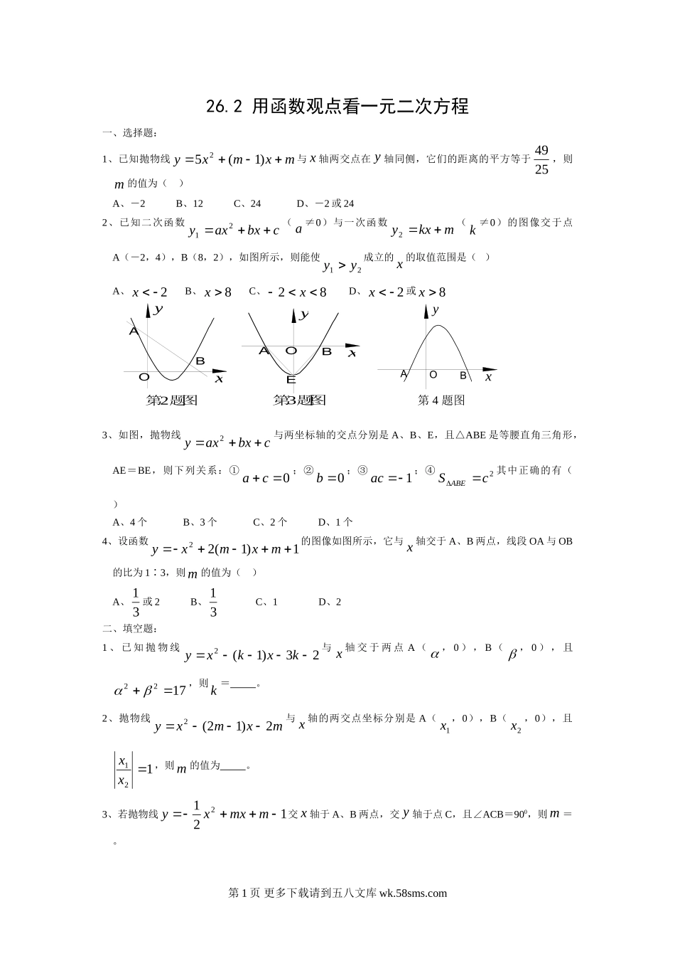 26.2用函数观点看一元二次方程一、选择题:1、已知抛物线mxmxy)1(52与x轴两交点在y轴同侧,它们的距离的平方等于2549,则m的值为()A、-2B、12C、24D、-2或242、已知二次函数cbxaxy21(a≠0)与...