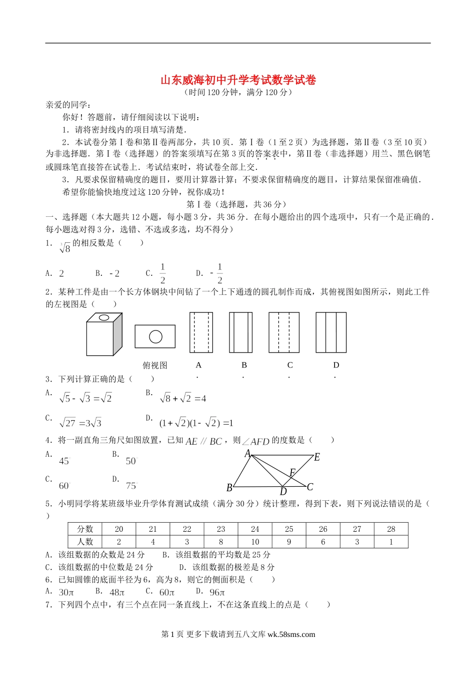 山东威海初中升学考试数学试卷(时间120分钟,满分120分)亲爱的同学:你好!答题前,请仔细阅读以下说明:1.请将密封线内的项目填写清楚.2.本试卷分第Ⅰ卷和第Ⅱ卷两部分,共10页.第Ⅰ卷(1至2页)为选择题...