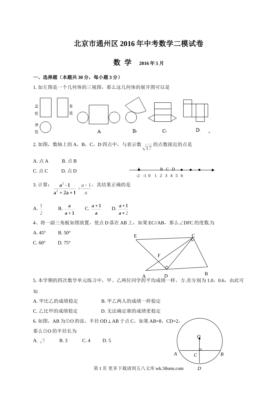 北京市通州区2016年中考数学二模试卷数学2016年5月一、选择题(本题共30分,每小题3分)1.如左图是一个几何体的三视图,那么这几何体的展开图可以是2.如图,数轴上的A,B,C,D四点中,与表示数的点数接近的点是A...