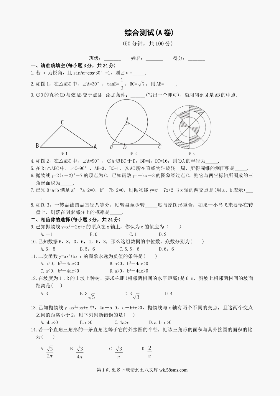 综合测试(A卷)(50分钟,共100分)班级:_______姓名:_______得分:_______一、请准确填空(每小题3分,共24分)1.若α为锐角,且sin2α+cos230°=1,则∠α=_____.2.如图1,在△ABC中,∠A=30°,tanB=,BC=,则AB=...
