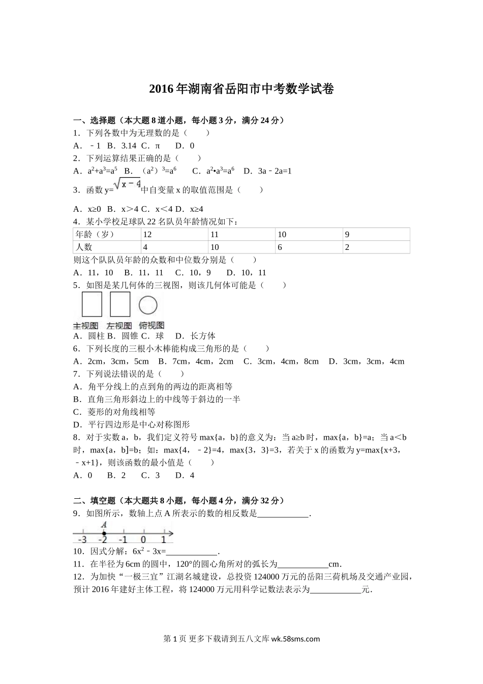 2016年岳阳市中考数学试题解析版.doc_第1页