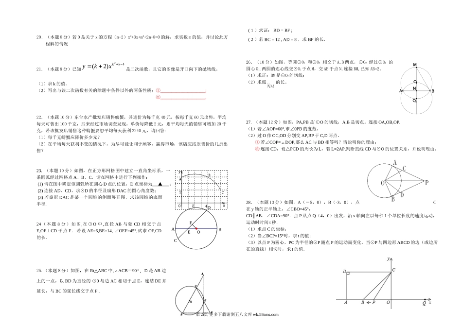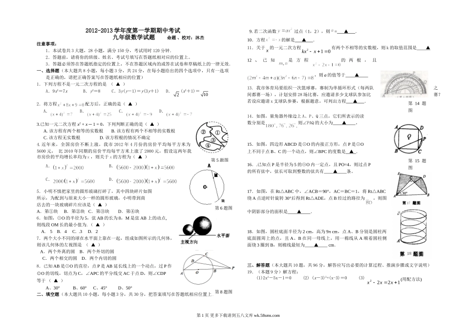 2012-2013学年度第一学期期中考试九年级数学试题命题、校对:沐杰注意事项:1.本试卷共3大题,28小题,满分150分,考试用时120分钟.2.答题前,请将你的班级、姓名、考试号填写在答题纸相对应的位置上。3.答题...