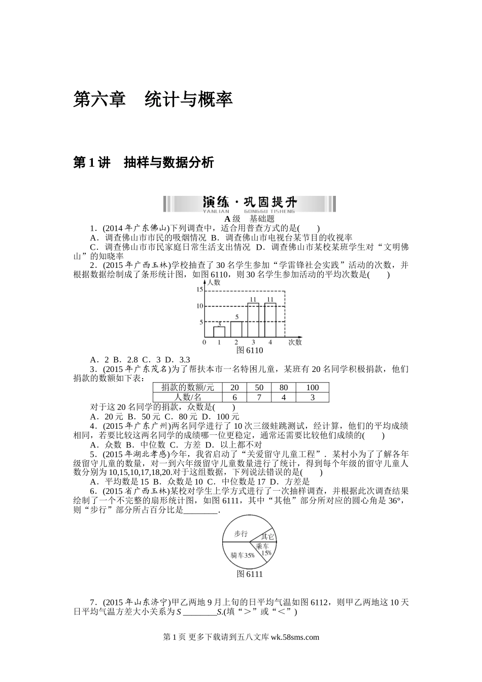 第六章统计与概率第1讲抽样与数据分析A级基础题1.(2014年广东佛山)下列调查中,适合用普查方式的是()A.调查佛山市市民的吸烟情况B.调查佛山市电视台某节目的收视率C.调查佛山市市民家庭日常生活支出情况D.调...