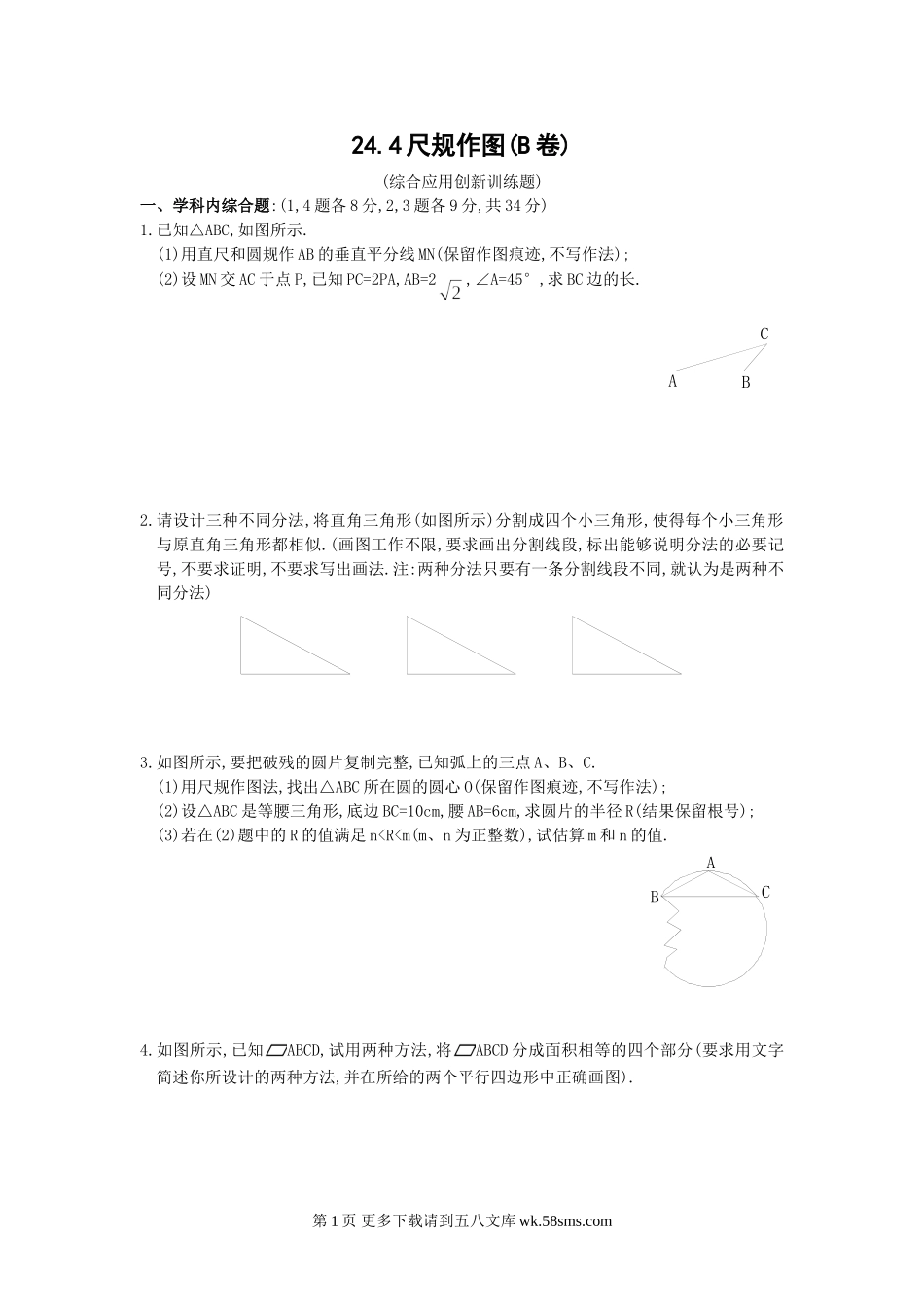 24.4尺规作图(B卷)(综合应用创新训练题)一、学科内综合题:(1,4题各8分,2,3题各9分,共34分)1.已知△ABC,如图所示.(1)用直尺和圆规作AB的垂直平分线MN(保留作图痕迹,不写作法);(2)设MN交AC于点P,已知PC=2PA,AB=2,∠...