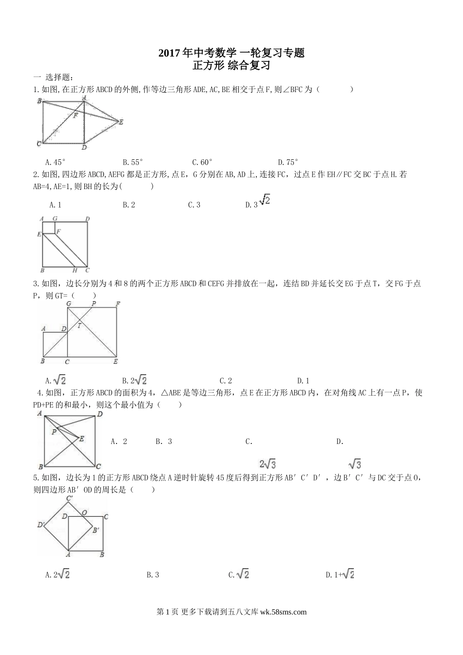 2017年中考数学一轮复习专题正方形综合复习一选择题:1.如图,在正方形ABCD的外侧,作等边三角形ADE,AC,BE相交于点F,则∠BFC为()A.45°B.55°C.60°D.75°2.如图,四边形ABCD,AEFG都是正方形,点E,G分别在AB,AD上,...