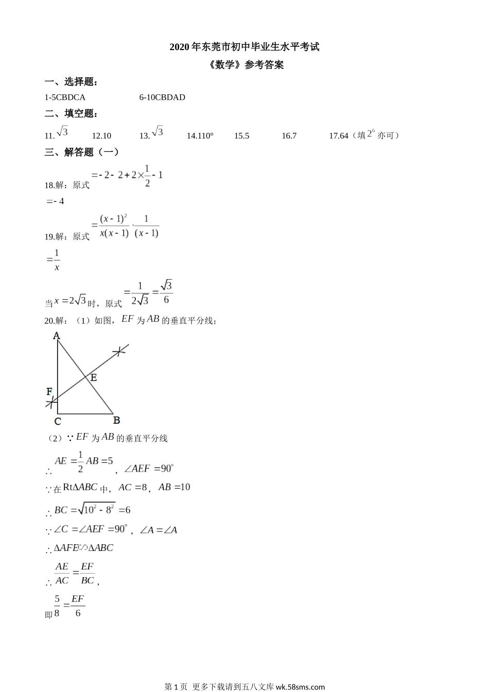 2020年东莞市初中毕业生水平考试《数学》参考答案一、选择题:1-5CBDCA6-10CBDAD二、填空题:11.12.1013.14.110°15.516.717.64(填亦可)三、解答题(一)18.解:原式19.解:原式当时,原式20.解:(1)如图,为...