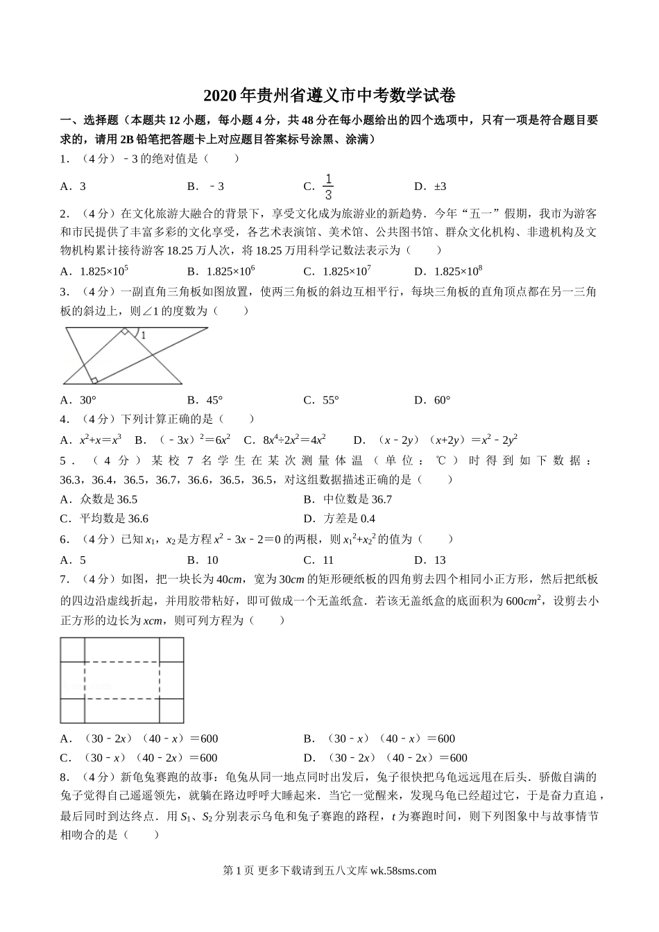 2020年贵州省遵义市中考数学试卷(原卷版).doc_第1页