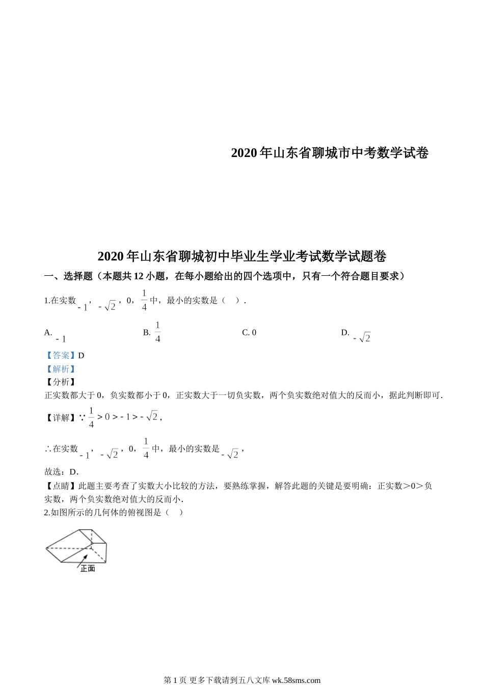 2020年山东省聊城市中考数学试卷2020年山东省聊城初中毕业生学业考试数学试题卷一、选择题(本题共12小题,在每小题给出的四个选项中,只有一个符合题目要求)1.在实数,,0,中,最小的实数是().A.B.C.0D.【...