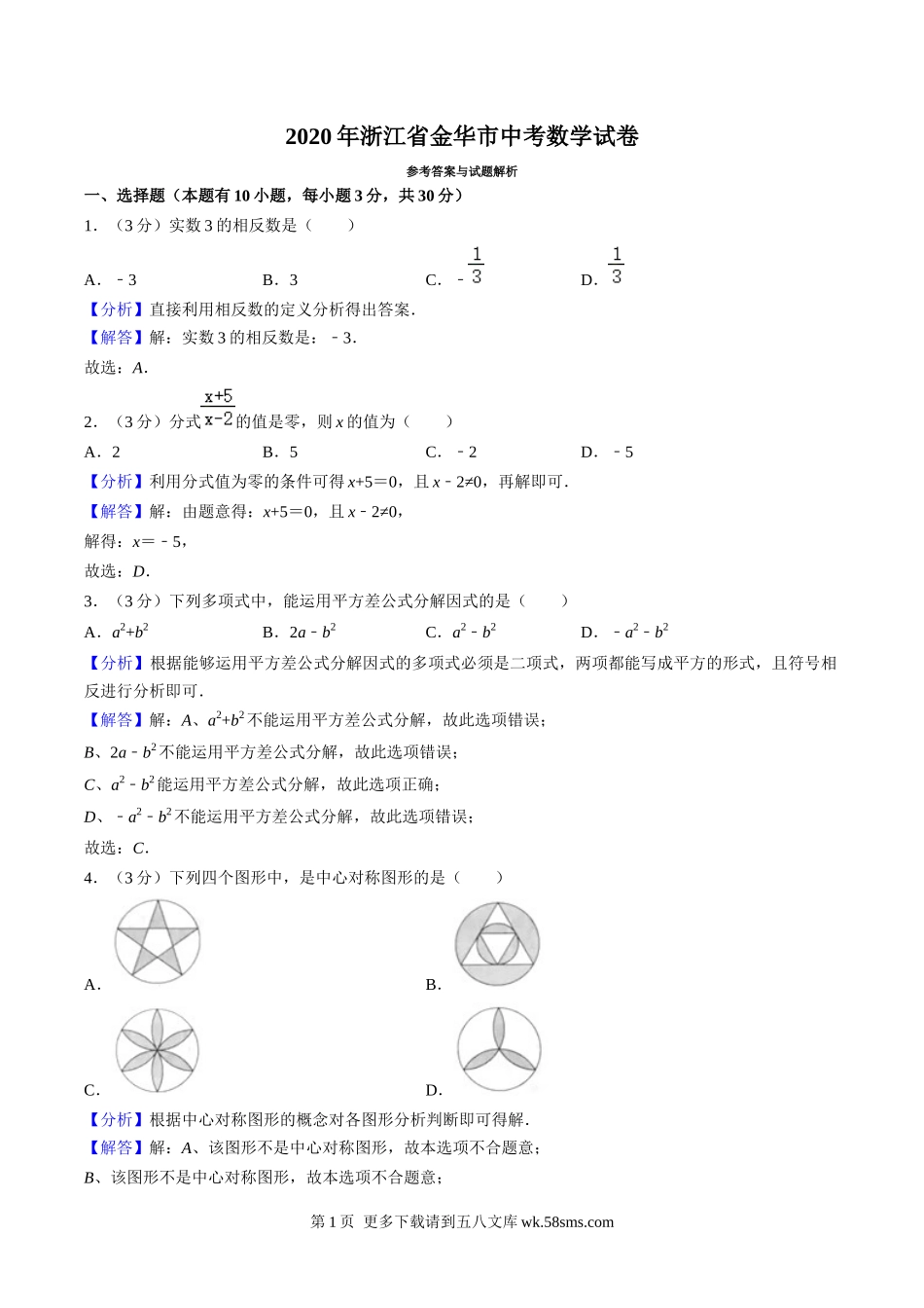 2020年浙江省金华市中考数学试卷(解析版).docx_第3页