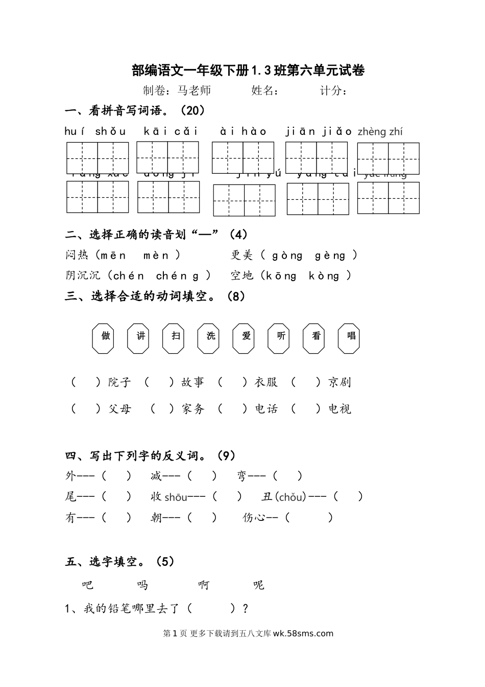 部编语文一年级下册1.3班第六单元试卷制卷:马老师姓名:计分:一、看拼音写词语。(20)huíshǒukāicǎiàihàojiānjiǎozhèngzhífànɡxuédònɡjījīnyúyánɡtáiyuèliɑng二、选择正确的读音划“—...