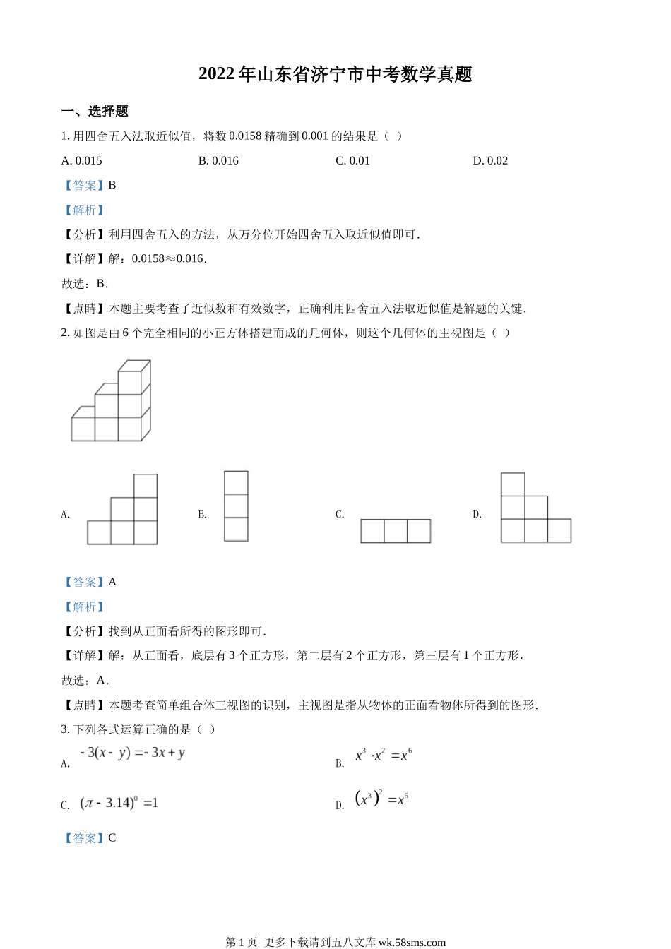 2022年山东省济宁市中考数学真题一、选择题1.用四舍五入法取近似值,将数0.0158精确到0.001的结果是()A.0.015B.0.016C.0.01D.0.02【答案】B【解析】【分析】利用四舍五入的方法,从万分位开始四舍五入取近似值...