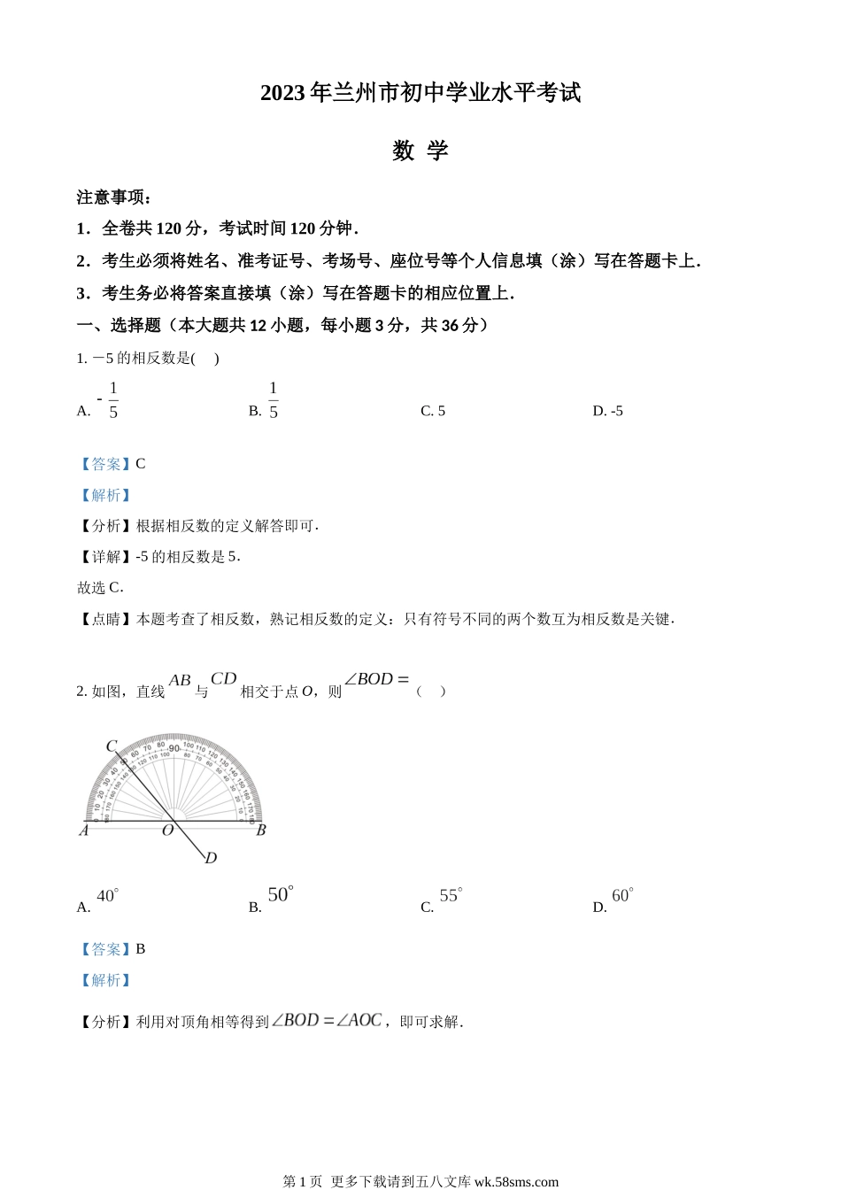2023年甘肃省兰州市中考数学真题(解析版).docx_第2页