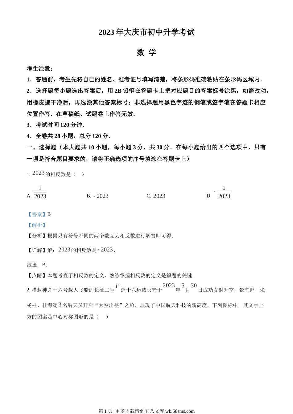 2023年大庆市初中升学考试数学考生注意:1.答题前,考生先将自己的姓名、准考证号填写清楚,将条形码准确粘贴在条形码区域内.2.选择题每小题选出答案后,用2B铅笔在答题卡上把对应题目的答案标号涂黑,如需改...