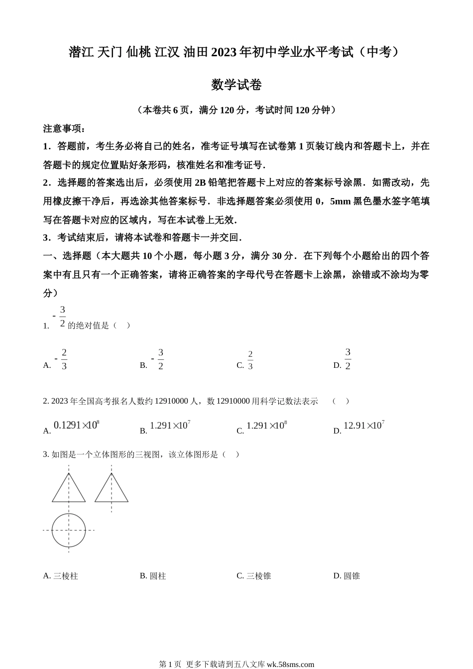 潜江天门仙桃江汉油田2023年初中学业水平考试(中考)数学试卷(本卷共6页,满分120分,考试时间120分钟)注意事项:1.答题前,考生务必将自己的姓名,准考证号填写在试卷第1页装订线内和答题卡上,并在答题卡的...