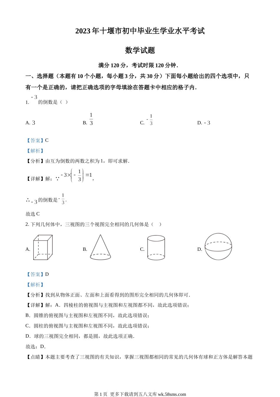 2023年湖北省十堰市中考数学真题(解析版).docx