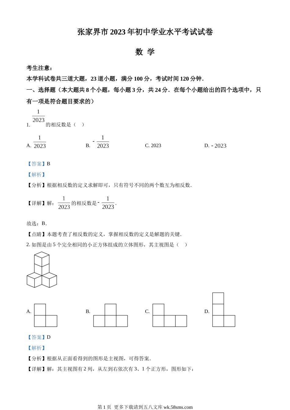 张家界市2023年初中学业水平考试试卷数学考生注意:本学科试卷共三道大题,23道小题,满分100分,考试时间120分钟.一、选择题(本大题共8个小题,每小题3分,共24分.在每个小题给出的四个选项中,只有一项是符...