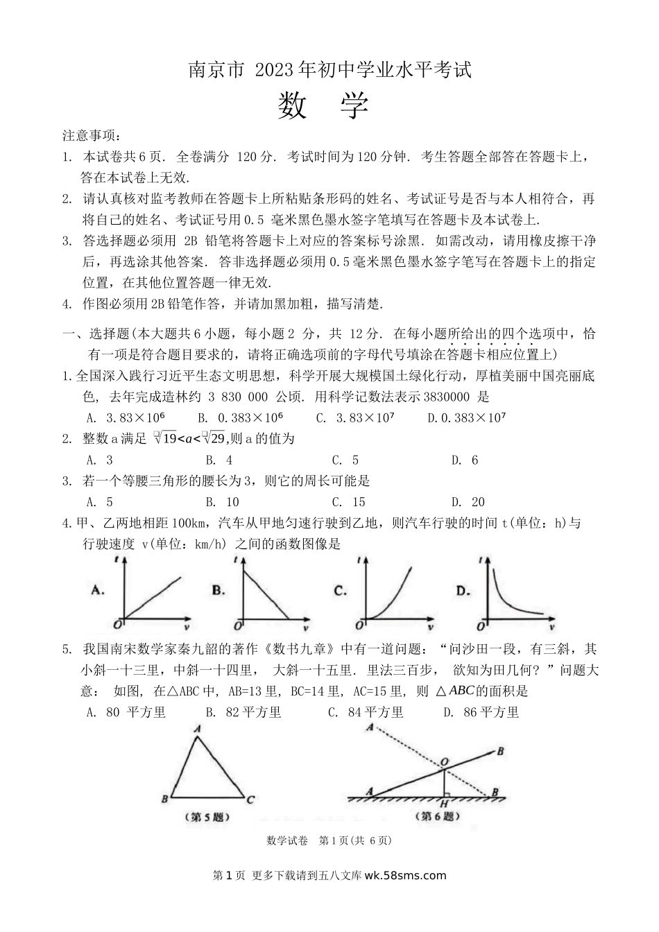 南京市2023年初中学业水平考试数学注意事项:1.本试卷共6页.全卷满分120分.考试时间为120分钟.考生答题全部答在答题卡上,答在本试卷上无效.2.请认真核对监考教师在答题卡上所粘贴条形码的姓名、考试证号是否与本...