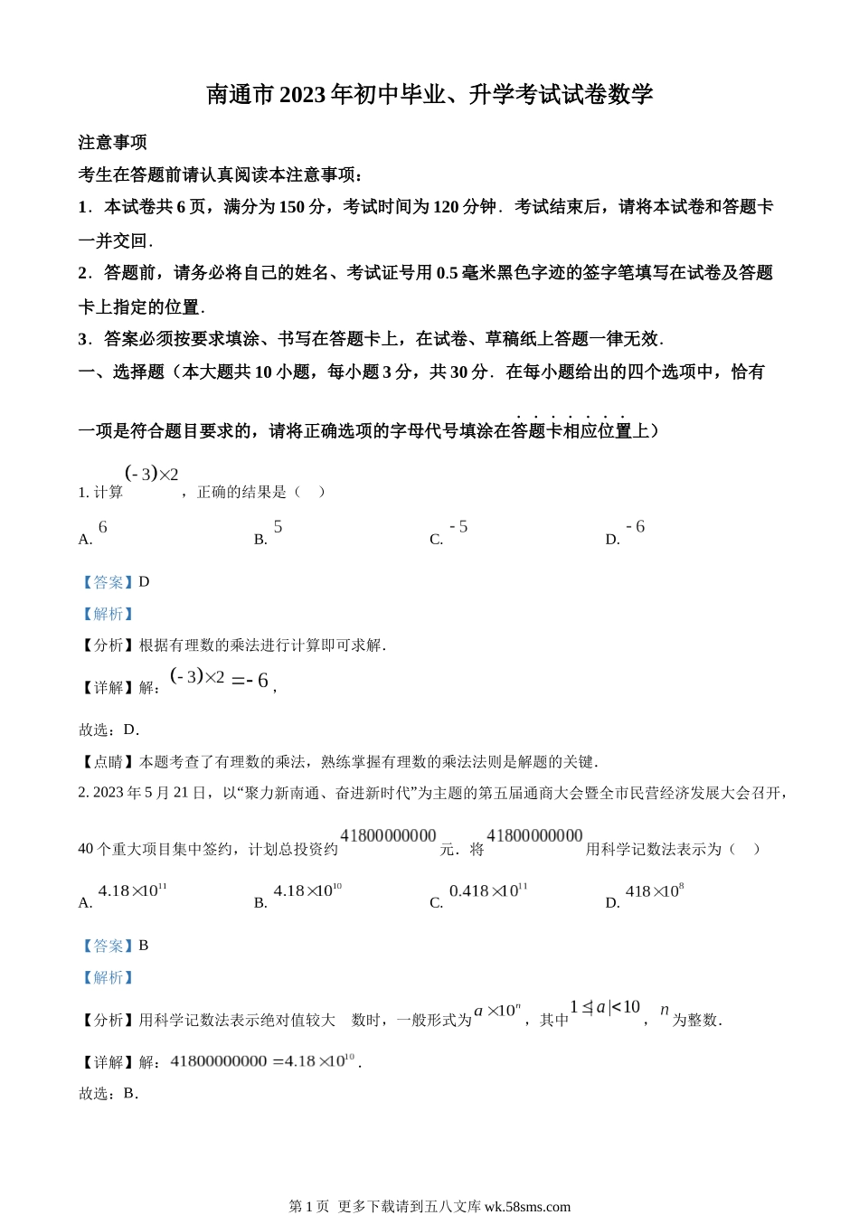 南通市2023年初中毕业、升学考试试卷数学注意事项考生在答题前请认真阅读本注意事项:1.本试卷共6页,满分为150分,考试时间为120分钟.考试结束后,请将本试卷和答题卡一并交回.2.答题前,请务必将自己的姓名...