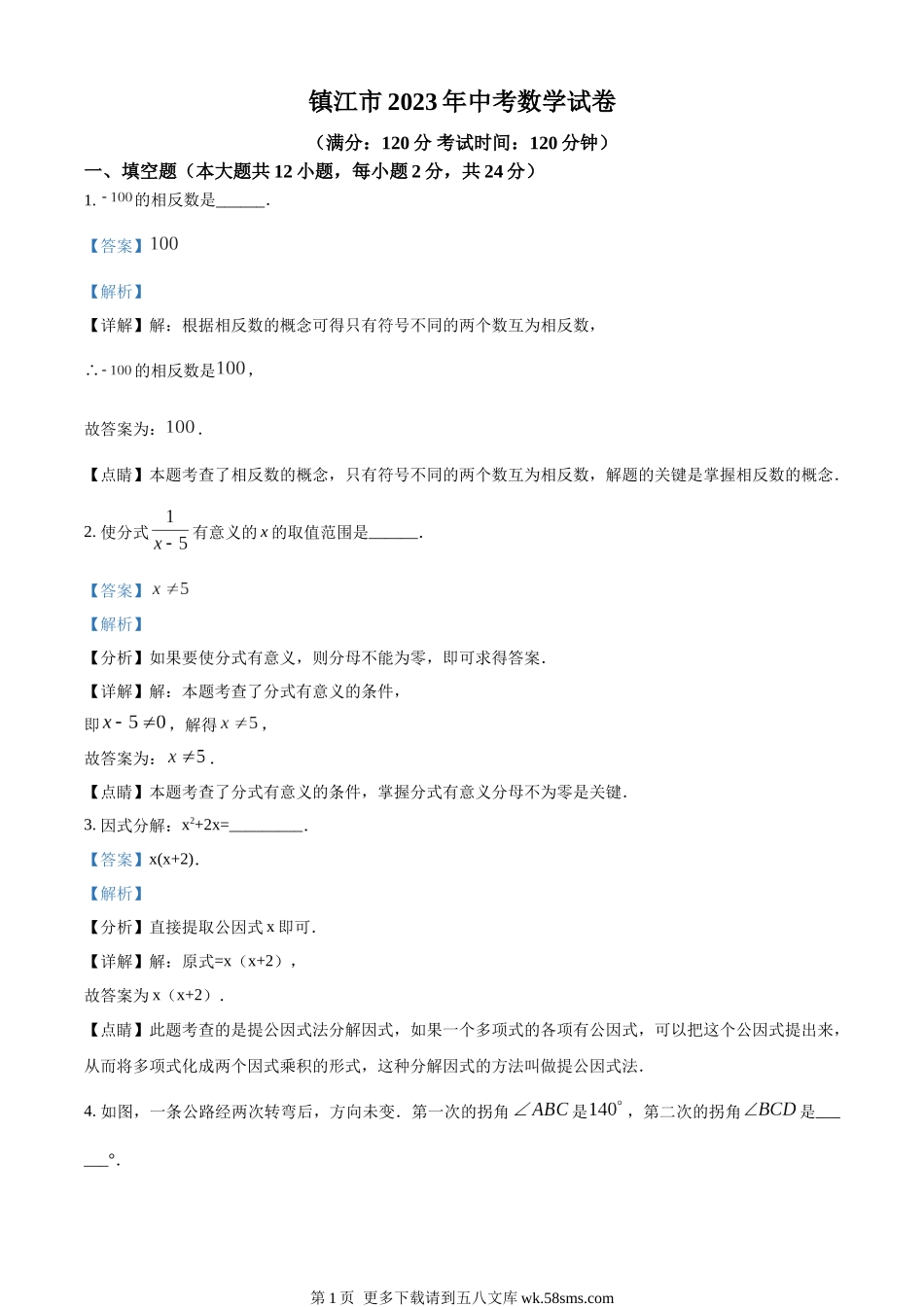 镇江市2023年中考数学试卷(满分:120分考试时间:120分钟)一、填空题(本大题共12小题,每小题2分,共24分)1.的相反数是______.【答案】【解析】【详解】解:根据相反数的概念可得只有符号不同的两个数互为相...