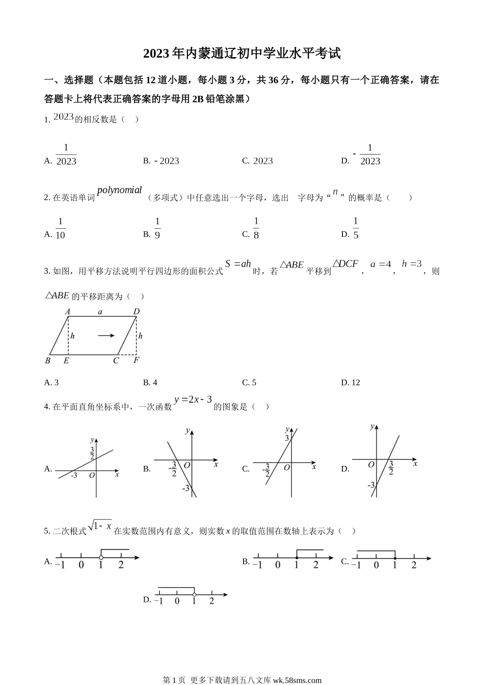 2023年内蒙通辽初中学业水平考试一、选择题(本题包括12道小题,每小题3分,共36分,每小题只有一个正确答案,请在答题卡上将代表正确答案的字母用2B铅笔涂黑)1.的相反数是()A.B.C.D.2.在英语单词(多项式)中...
