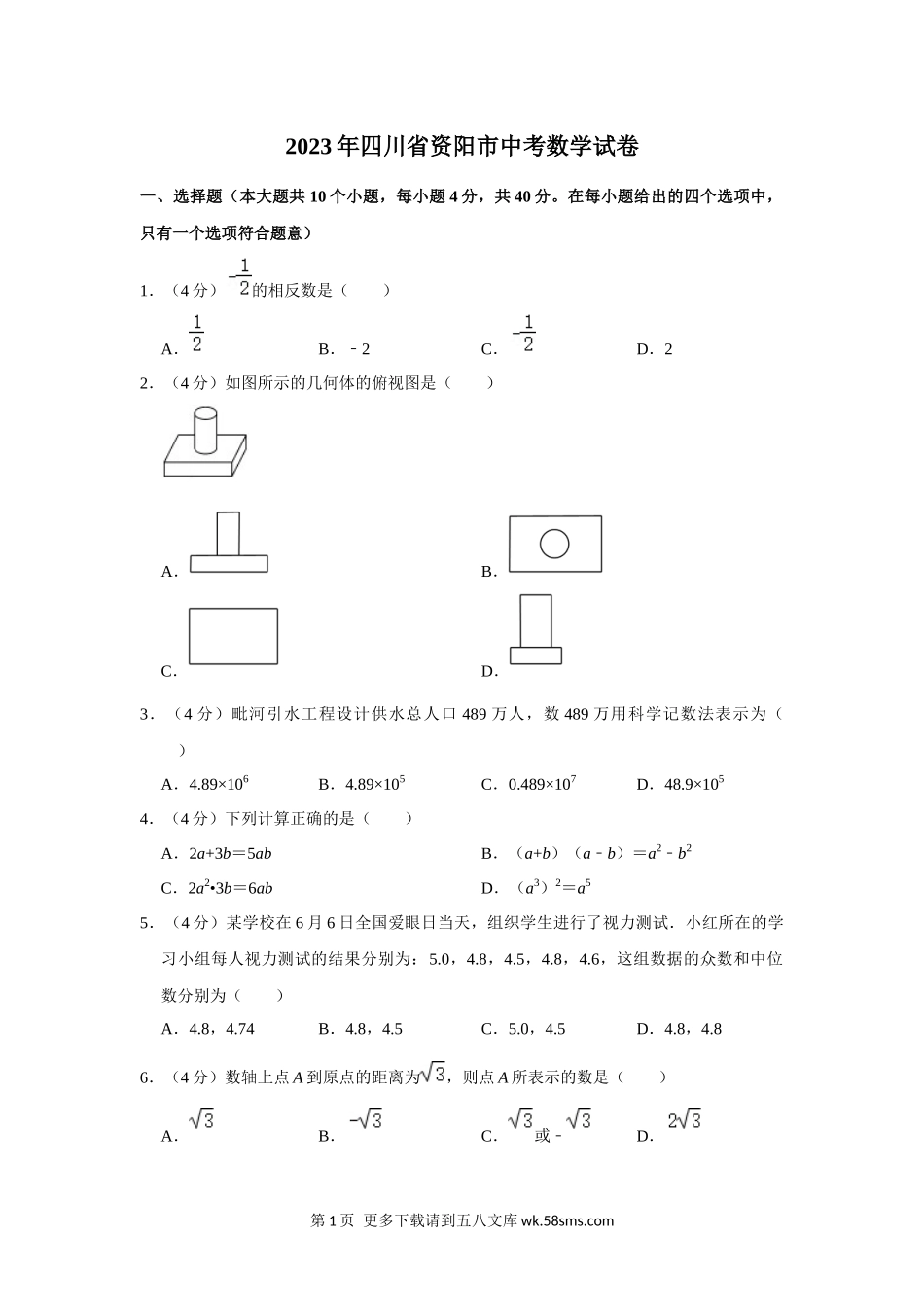 2023年四川省资阳市中考数学真题.docx_第1页