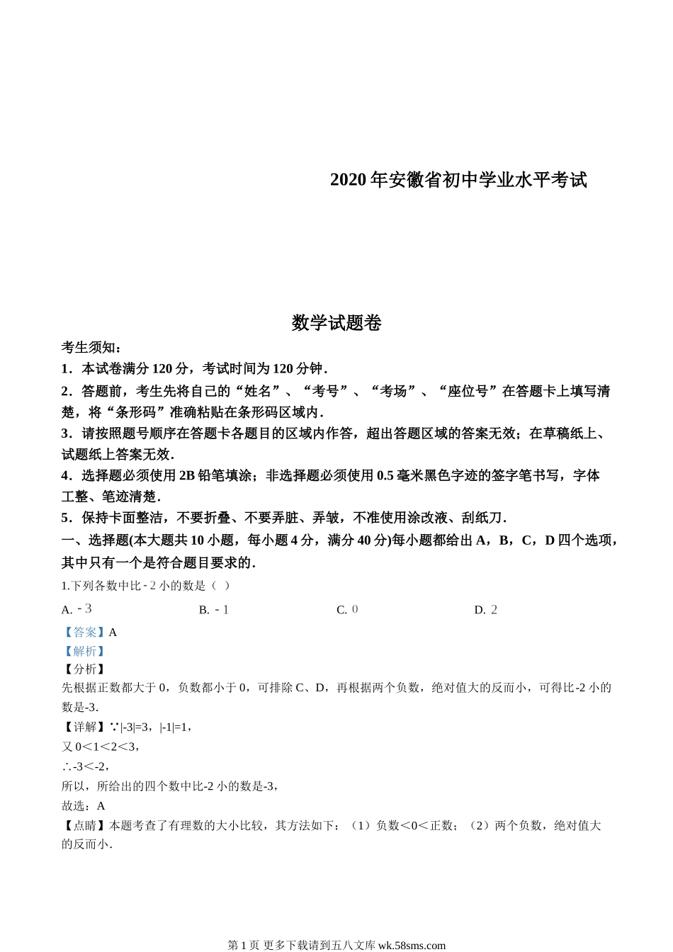 2020年安徽省初中学业水平考试数学试题卷考生须知:1.本试卷满分120分,考试时间为120分钟.2.答题前,考生先将自己的“姓名”、“考号”、“考场”、“座位号”在答题卡上填写清楚,将“条形码”准确粘贴在条...