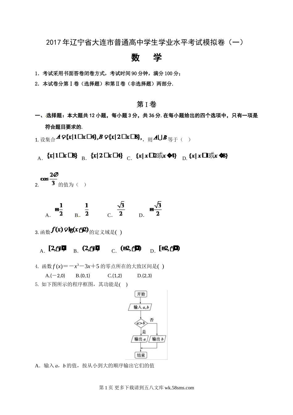 2017年辽宁省大连市普通高中学生学业水平考试模拟卷(一)数学1.考试采用书面答卷闭卷方式,考试时间90分钟,满分100分;2.本试卷分第Ⅰ卷(选择题)和第Ⅱ卷(非选择题)两部分.第Ⅰ卷一、选择题:本大题共12...