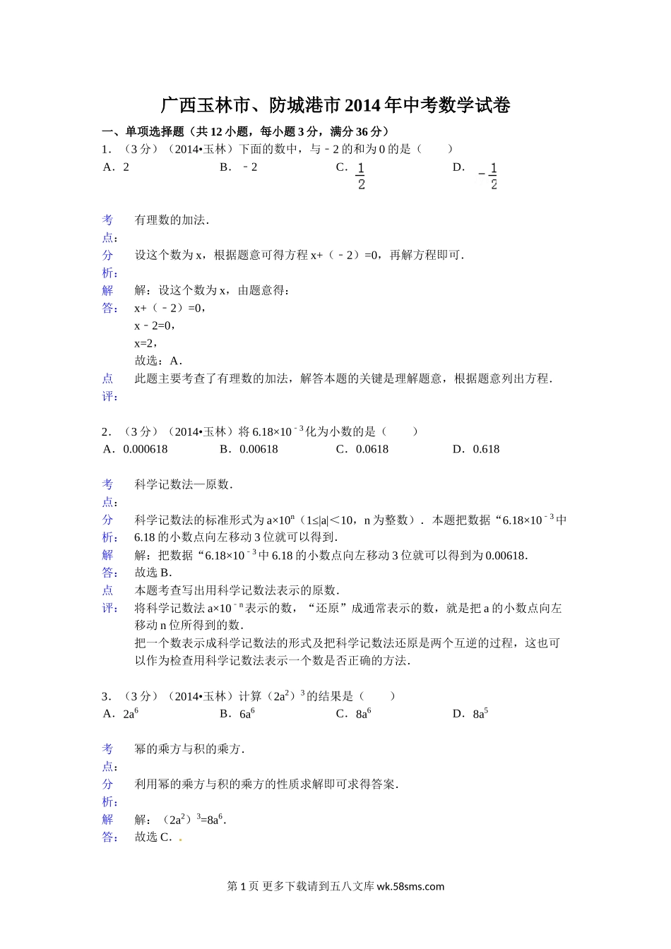 广西玉林市、防城港市2014年中考数学试题(word版,含解析).doc_第1页