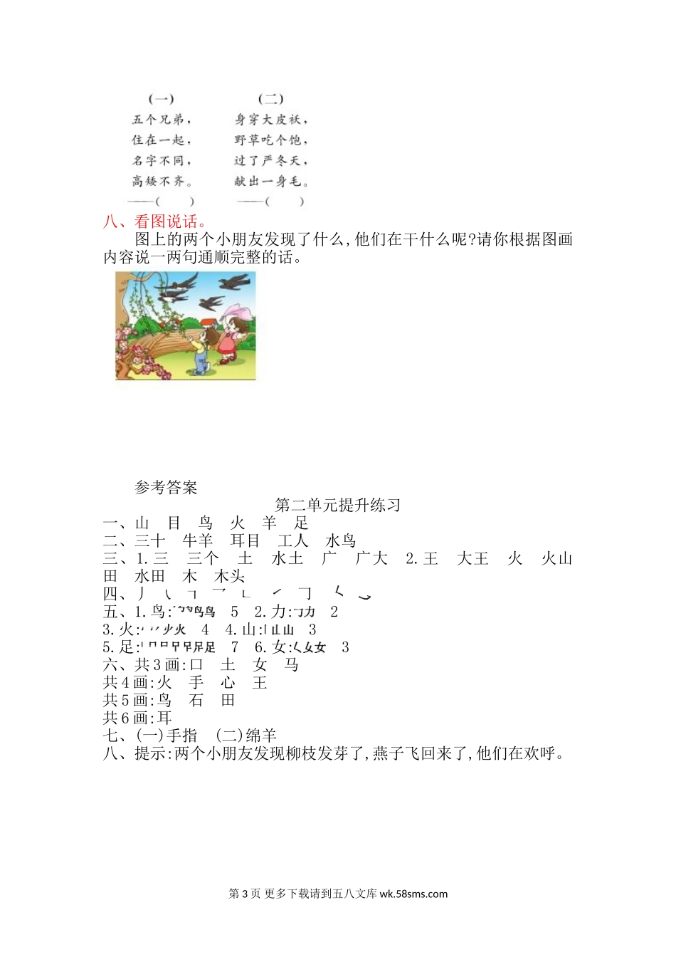 第二单元提升练习一、看图写汉字。二、照样子,连一连,再把组成的词写出来。三、汉字魔法屋。1.照样子,加一笔,变成另一个字,再组词。2.加两笔,变成另一个字,再组词。第1页更多下载请到五八文库wk.58sms.com四、读...