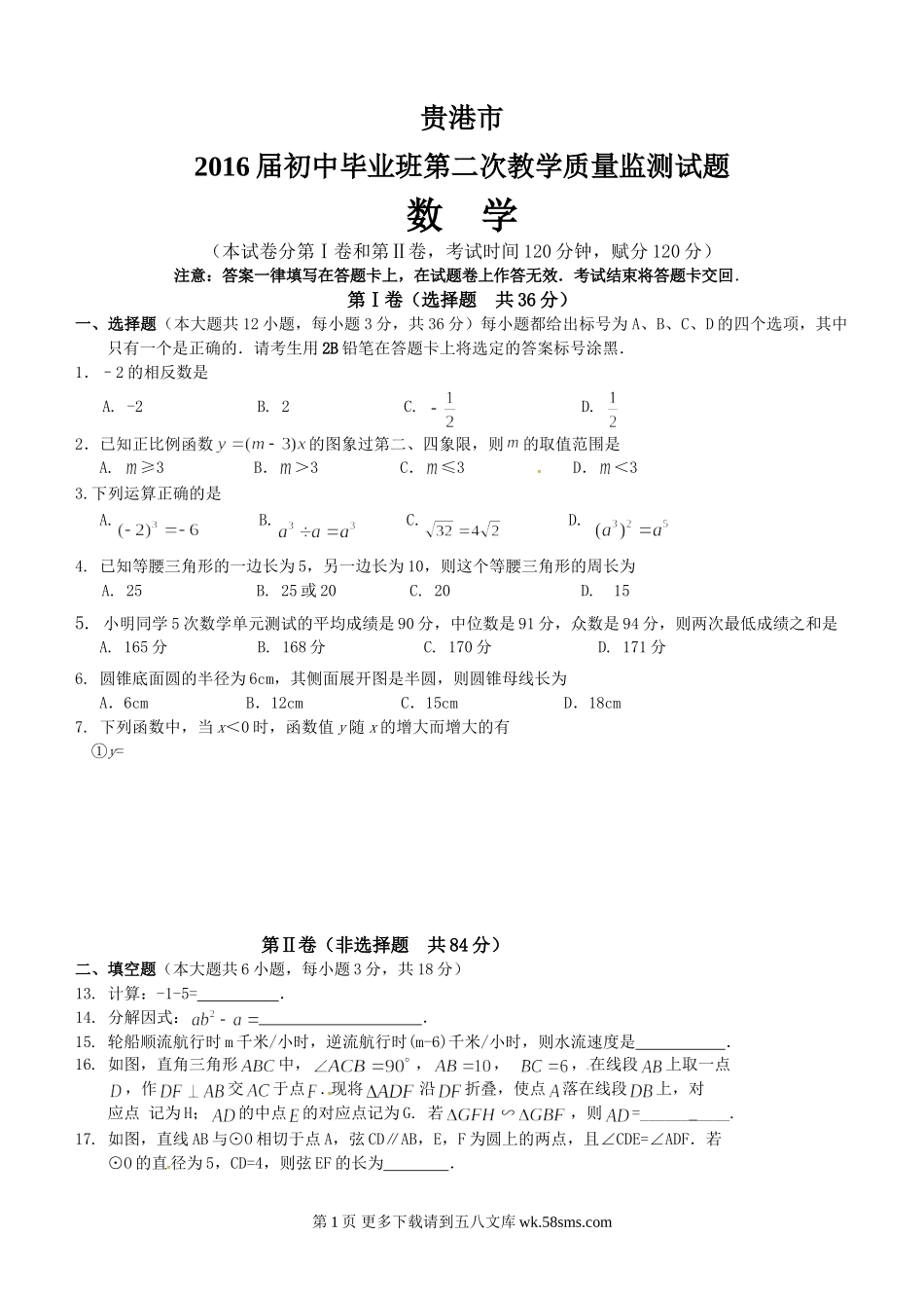 贵港市2016届初中毕业班第二次教学质量监测试题数学(本试卷分第Ⅰ卷和第Ⅱ卷,考试时间120分钟,赋分120分)注意:答案一律填写在答题卡上,在试题卷上作答无效.考试结束将答题卡交回.第Ⅰ卷(选择题共36分)...