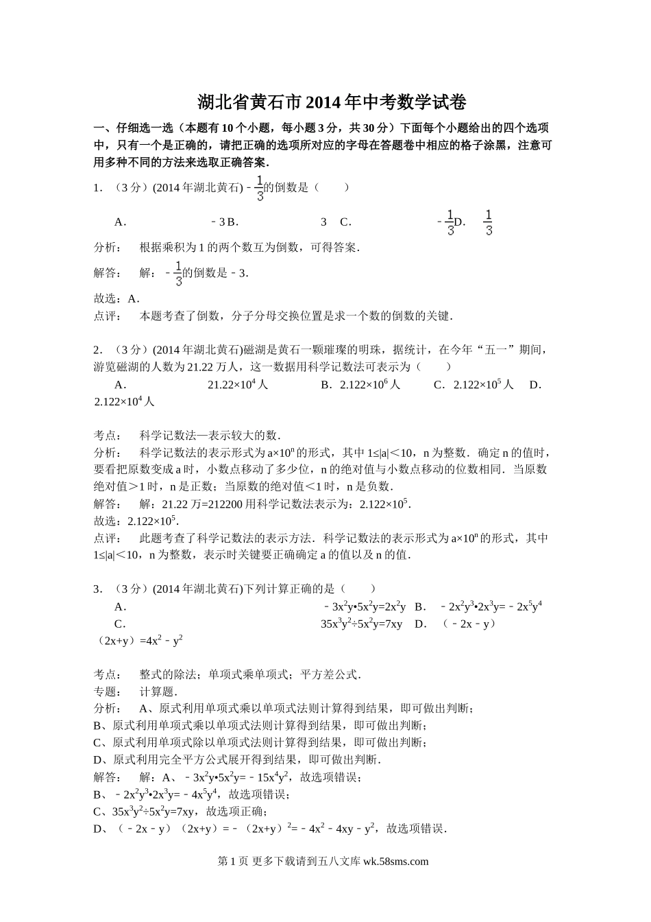 湖北省黄石市2014年中考数学试卷(解析版).doc