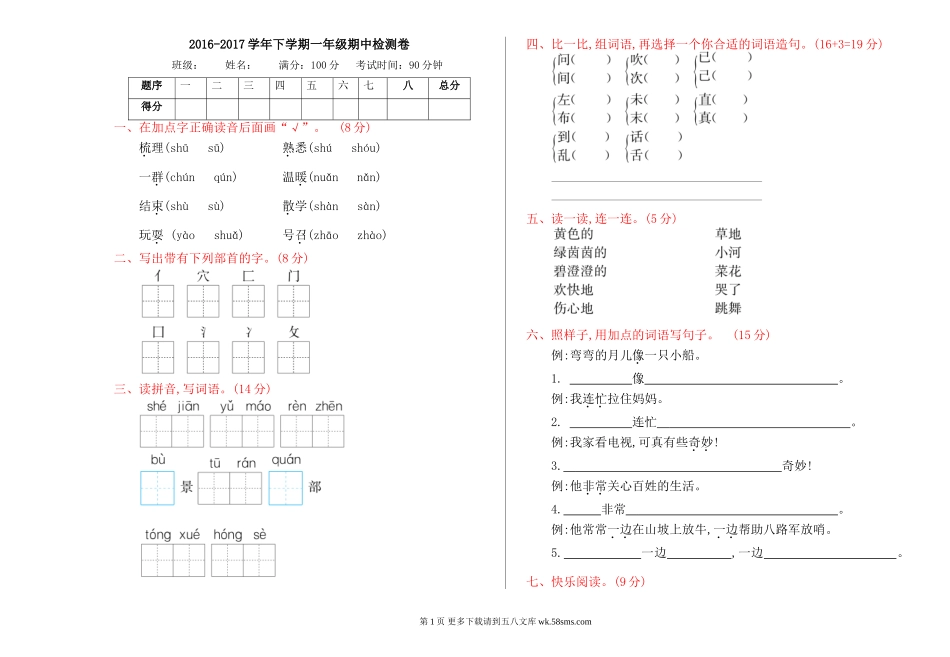 2016-2017学年下学期一年级期中检测卷班级:姓名:满分:100分考试时间:90分钟题序一二三四五六七八总分得分一、在加点字正确读音后面画“√”。(8分)梳理(shūsū)熟悉(shúshóu)一群(chúnqún)温暖(nuǎnnǎ...