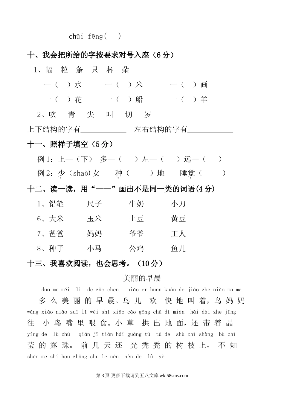 2016—2017学年北师大版一年级语文上册期末试卷.doc_第3页