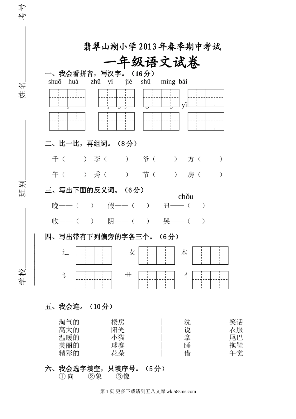 翡翠山湖小学2013年春季期中考试一年级语文试卷一、我会看拼音,写汉字。(16分)shuōhuàzhǔyìjièshūmíngbáimǎyǐpénɡyǒugāoxìnɡyǐhòu二、比一比,再组词。(8分)千()李()爷()方()午(...
