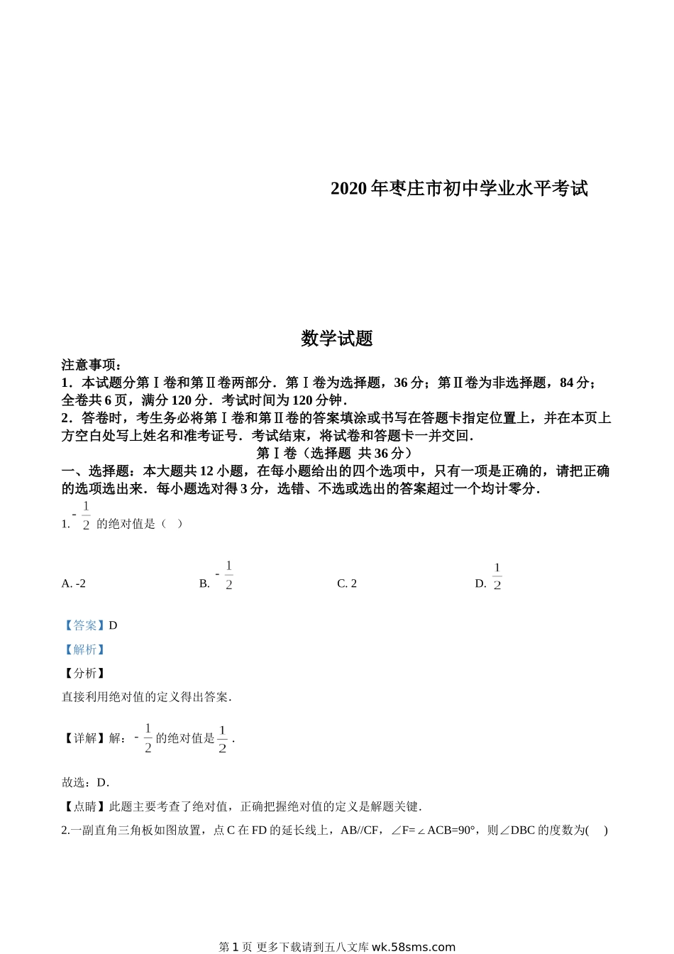 2020年枣庄市初中学业水平考试数学试题注意事项:1.本试题分第Ⅰ卷和第Ⅱ卷两部分.第Ⅰ卷为选择题,36分;第Ⅱ卷为非选择题,84分;全卷共6页,满分120分.考试时间为120分钟.2.答卷时,考生务必将第Ⅰ卷和第...