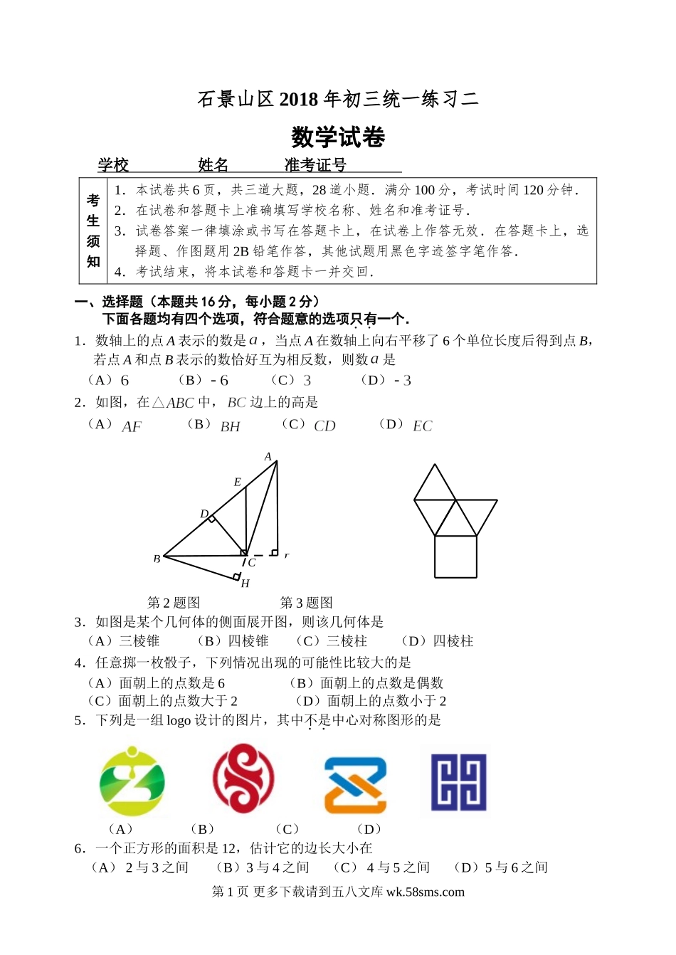 HFEDCBA石景山区2018年初三统一练习二数学试卷学校姓名准考证号考生须知1.本试卷共6页,共三道大题,28道小题.满分100分,考试时间120分钟.2.在试卷和答题卡上准确填写学校名称、姓名和准考证号.3.试卷答案...