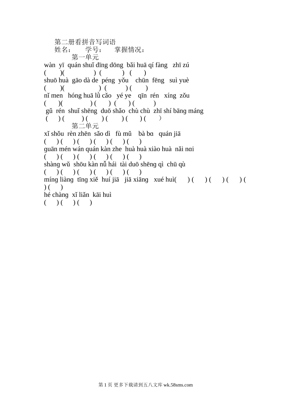 第二册看拼音写词语姓名:学号:掌握情况:第一单元wànyīquánshuǐdīngdōngbǎihuāqífàngzhīzú()()()()shuōhuàgāodàdepéngyǒuchūnfēngsuìyuè()()()()nǐmenhónghuālǜcǎoyéyeqīnrénxí...