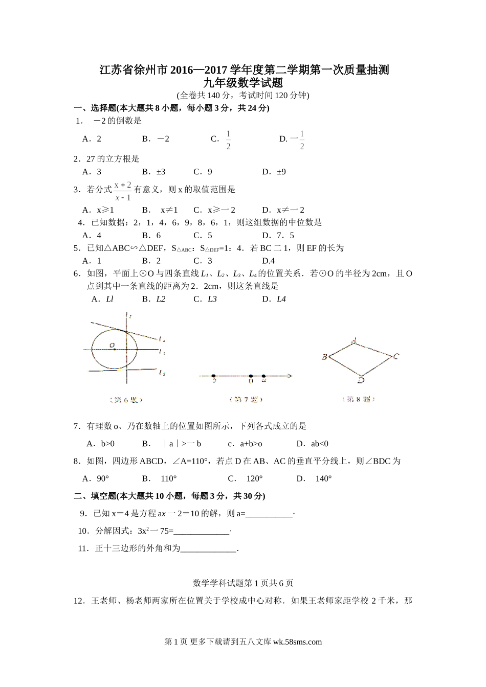 徐州市2017年第二学期九年级第一次质量抽测数学试卷及答案.doc_第1页