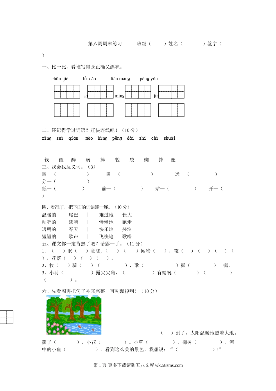 第六周周末练习班级()姓名()签字()一、比一比,看谁写得既正确又漂亮。chūnjiélǜcǎoliánmánɡpénɡyǒumǔqīnshuōhuàmínɡliànɡɡānjìnɡ二、还记得学过词语?赶快连线吧!(10分)xǐnɡzu...