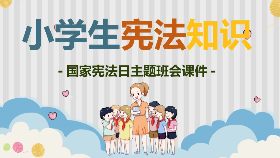 小学生宪法知识-国家宪法日主题班会课件-目录国家宪法日介绍什么是宪法宪法与小学生有关的规定小学生应知法律小知识01020304国家宪法日介绍第一章国家宪法成立时间2014年11月1日第十二届全国人民代表大会常务委员...