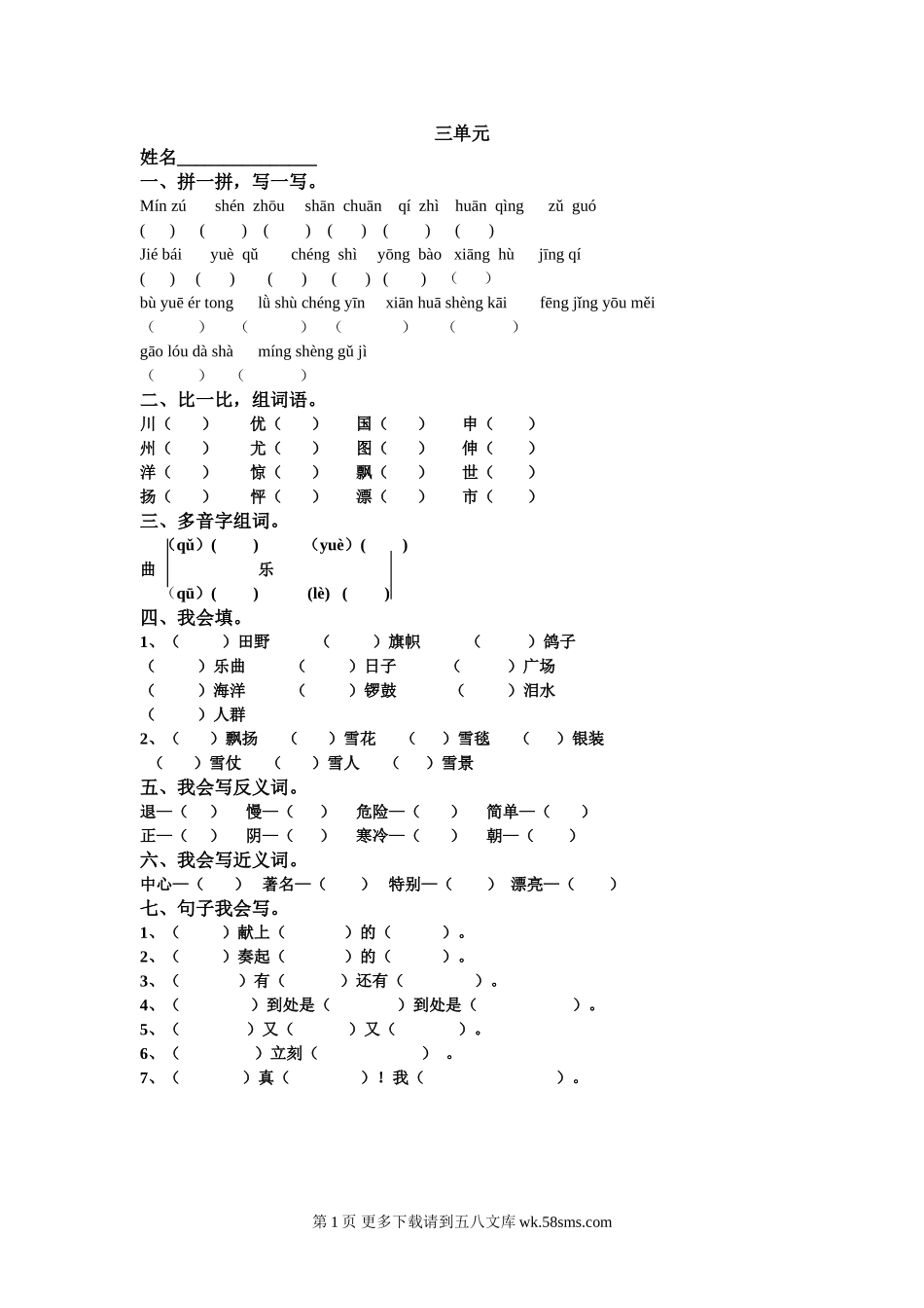 三单元姓名_______________一、拼一拼,写一写。Mínzúshénzhōushānchuānqízhìhuānqìngzǔguó()()()()()()Jiébáiyuèqǔchéngshìyōngbàoxiānghùjīngqí()()()()()()bùyuēértonglǜshùch...